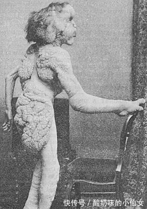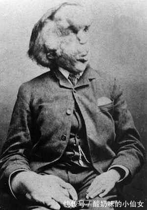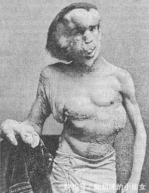 他那巨大而畸形的脑袋,额头上肿着一个巨大的骨块,后脑勺的褐色皮肤呈现海绵状。前额骨的畸形生长几乎挡住一只眼睛。从嘴巴上颚又长出一大块骨头,使他的话语也变得模糊不清,还流着口水。整体来看,他的脸就像一块粗糙的木头,没有任何表情。背部的肉块像麻袋一样一直垂到大腿中间,上面同样覆盖着令人恶心的褐色皮肤,胸部的皮肤也是如此。右手几乎无法使用,像鱼鳍一样又大又笨。相反左手则与常人无异,皮肤光滑。下肢也具有畸形的特征,笨拙不堪。